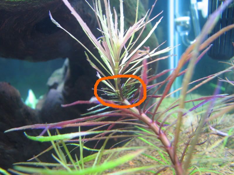 I circled in orange the weird stage of growth below. Everything below that was grown in a lower light tank. Then, ever since this tank has been set up, the circled region was all I got. Now, within the last couple of days, all the stems of this plant have grown like crazy, and you can see that above the circled area.