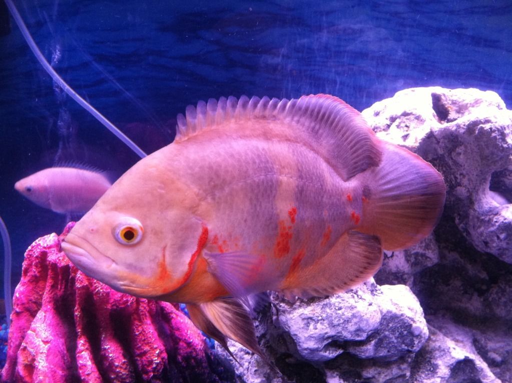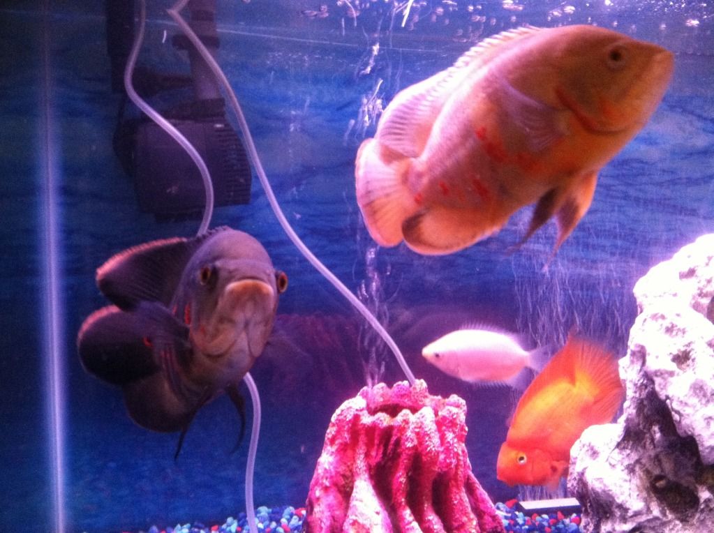 Oscars, one of the parrots (the other one likes to be inside the volcano), and one of the kissing gouramis