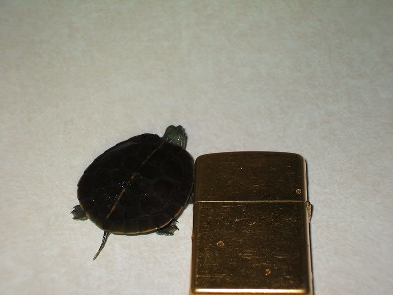 About 2 inches long. Comes with an almost full jar of turtle food and whatever's left of other jars. The zippo is for size reference, turtle is a non-smoker.